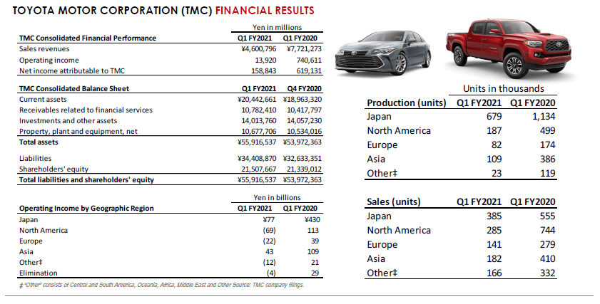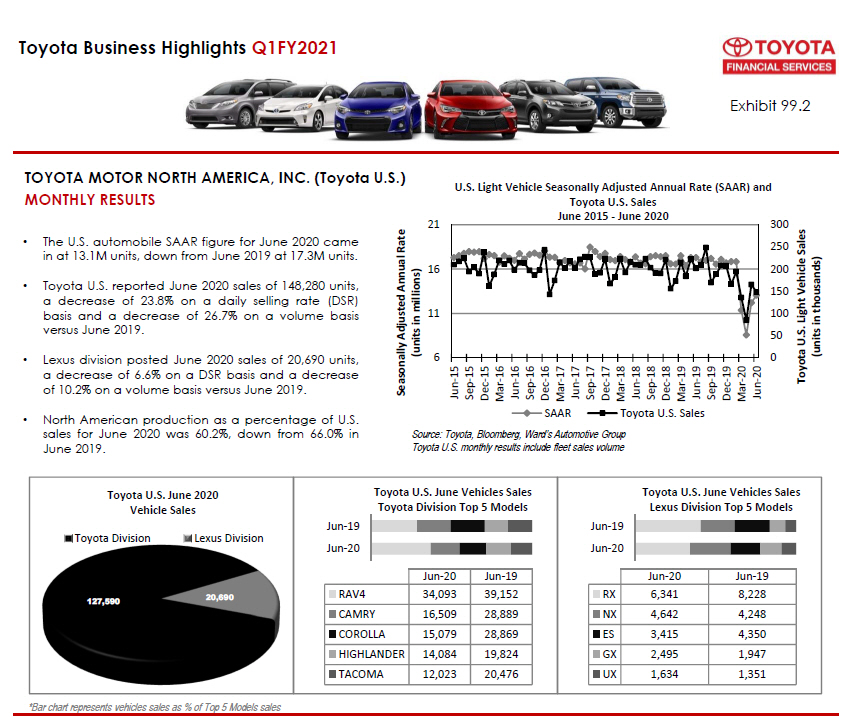 Toyota Business Highlights Q1FY2021 TOYOTA MOTOR NORTH MERICA, INC. (Toyota U.S.) MONTHLY RESULTS • The U . S . automobile SAAR figure for June 2020 came in at 13 . 1 M units, down from June 2019 at 17 . 3 M units . • Toyota U . S . reported June 2020 sales of 148 , 280 units, a decrease of 23 . 8 % on a daily selling rate (DSR) basis and a decrease of 26 . 7 % on a volume basis versus June 2019 . • Lexus division posted June 2020 sales of 20 , 690 units, a decrease of 6 . 6 % on a DSR basis and a decrease of 10 . 2 % on a volume basis versus June 2019 . • North American production as a percentage of U . S . sales for June 2020 was 60 . 2 % , down from 66 . 0 % in June 2019 . Source: Toyota, Bloomberg, Ward’s Automotive Group Toyota U.S. monthly results include fleet sales volume TOYOTA MOTOR CORPORATION (TMC) FINANCIAL RESULTS ‡ “Other” consists of Central and South America, Oceania, Africa, Middle East and Other Source: TMC company filings. Production (units) Q1 FY2021 Q1 FY2020 Japan 679 1,134 North America 187 499 Europe 82 174 Asia 109 386 Other‡ 23 119 Sales (units) Q1 FY2021 Q1 FY2020 Japan 385 555 North America 285 744 Europe 141 279 Asia 182 410 Other‡ 166 332 Units in thousands TMC Consolidated Financial Performance Q1 FY2021 Q1 FY2020 Sales revenues ¥4,600,796 ¥7,721,273 Operating income 13,920 740,611 Net income attributable to TMC 158,843 619,131 TMC Consolidated Balance Sheet Q1 FY2021 Q4 FY2020 Current assets ¥20,442,661 ¥18,963,320 Receivables related to financial services 10,782,410 10,417,797 Investments and other assets 14,013,760 14,057,230 Property, plant and equipment, net 10,677,706 10,534,016 Total assets ¥55,916,537 ¥53,972,363 Liabilities ¥34,408,870 ¥32,633,351 Shareholders' equity 21,507,667 21,339,012 Total liabilities and shareholders' equity ¥55,916,537 ¥53,972,363 Yen in billions Operating Income by Geographic Region Q1 FY2021 Q1 FY2020 Japan ¥77 ¥430 North America (69) 113 Europe (22) 39 Asia 43 109 Other‡ (12) 21 Elimination (4) 29 Yen in millions *Bar chart represents vehicles sales as % of Top 5 Models sales 0 50 100 150 200 250 300 6 11 16 21 Jun-15 Sep-15 Dec-15 Mar-16 Jun-16 Sep-16 Dec-16 Mar-17 Jun-17 Sep-17 Dec-17 Mar-18 Jun-18 Sep-18 Dec-18 Mar-19 Jun-19 Sep-19 Dec-19 Mar-20 Jun-20 Toyota U.S. Light Vehicle Sales (units in thousands) Seasonally Adjusted Annual Rate (units in millions) U.S. Light Vehicle Seasonally Adjusted Annual Rate (SAAR) and Toyota U.S. Sales June 2015 - June 2020 SAAR Toyota U.S. Sales 127,590 20,690 Toyota Division Lexus Division Toyota U.S. June 2020 Vehicle Sales Jun-20 Jun-19 Jun-20 Jun-19 RAV4 34,093 39,152 CAMRY 16,509 28,889 COROLLA 15,079 28,869 HIGHLANDER 14,084 19,824 TACOMA 12,023 20,476 Toyota U.S. June Vehicles Sales Toyota Division Top 5 Models Jun-20 Jun-19 Jun-20 Jun-19 RX 6,341 8,228 NX 4,642 4,248 ES 3,415 4,350 GX 2,495 1,947 UX 1,634 1,351 Toyota U.S. June Vehicles Sales Lexus Division Top 5 Models Exhibit 99.2