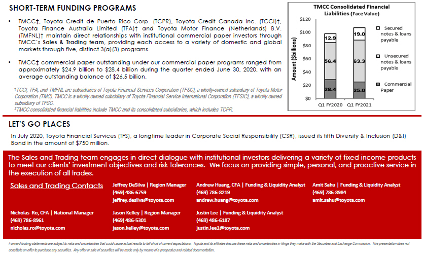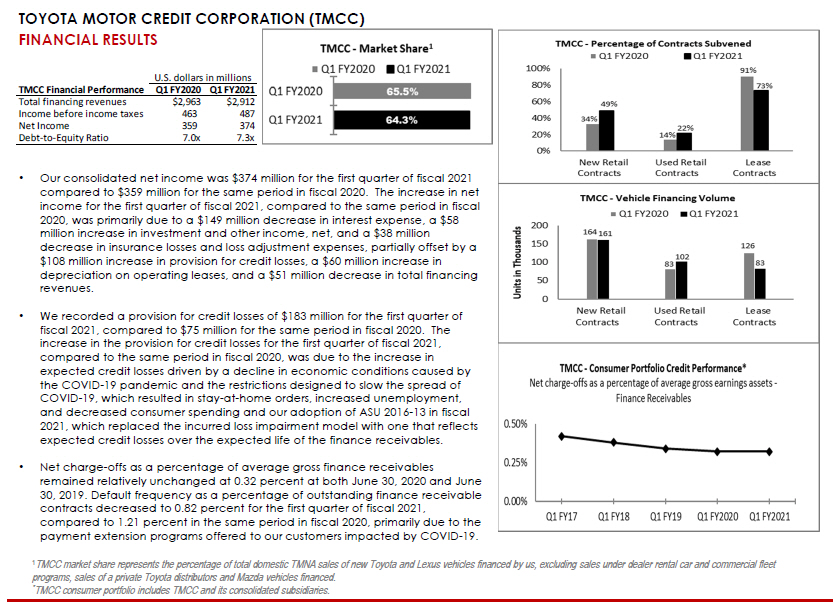 TOYOTA MOTOR CREDIT CORPORATION (TMCC) FINANCIAL RESULTS • Our consolidated net income was $374 million for the first quarter of fiscal 2021 compared to $359 million for the same period in fiscal 2020. The increase in net income for the first quarter of fiscal 2021, compared to the same period in fiscal 2020, was primarily due to a $149 million decrease in interest expense, a $58 million increase in investment and other income, net, and a $38 million decrease in insurance losses and loss adjustment expenses, partially offset by a $108 million increase in provision for credit losses, a $60 million increase in depreciation on operating leases, and a $51 million decrease in total financing revenues. • We recorded a provision for credit losses of $183 million for the first quarter of fiscal 2021, compared to $75 million for the same period in fiscal 2020. The increase in the provision for credit losses for the first quarter of fiscal 2021, compared to the same period in fiscal 2020, was due to the increase in expected credit losses driven by a decline in economic conditions caused by the COVID - 19 pandemic and the restrictions designed to slow the spread of COVID - 19, which resulted in stay - at - home orders, increased unemployment, and decreased consumer spending and our adoption of ASU 2016 - 13 in fiscal 2021, which replaced the incurred loss impairment model with one that reflects expected credit losses over the expected life of the finance receivables. • Net charge - offs as a percentage of average gross finance receivables remained relatively unchanged at 0.32 percent at both June 30, 2020 and June 30, 2019. Default frequency as a percentage of outstanding finance receivable contracts decreased to 0.82 percent for the first quarter of fiscal 2021, compared to 1.21 percent in the same period in fiscal 2020, primarily due to the payment extension programs offered to our customers impacted by COVID - 19. 1 TMCC market share represents the percentage of total domestic TMNA sales of new Toyota and Lexus vehicles financed by us, exc lud ing sales under dealer rental car and commercial fleet programs, sales of a private Toyota distributors and Mazda vehicles financed. * TMCC consumer portfolio includes TMCC and its consolidated subsidiaries. SHORT - TERM FUNDING PROGRAMS • TMCC ‡ , Toyota Credit de Puerto Rico Corp . (TCPR), Toyota Credit Canada Inc . (TCCI)†, Toyota Finance Australia Limited (TFA)† and Toyota Motor Finance (Netherlands) B . V . (TMFNL)† maintain direct relationships with institutional commercial paper investors through TMCC’s Sales & Trading team , providing each access to a variety of domestic and global markets through five, distinct 3 (a)( 3 ) programs . • TMCC ‡ c ommercial paper outstanding under our commercial paper programs ranged from approximately $ 24 . 9 billion to $ 28 . 4 billion during the quarter ended June 30 , 2020 , with an average outstanding balance of $ 26 . 5 billion . † TCCI, TFA, and TMFNL are subsidiaries of Toyota Financial Services Corporation (TFSC), a wholly - owned subsidiary of Toyota Motor Corporation (TMC). TMCC is a wholly - owned subsidiary of Toyota Financial Service International Corporation (TFSIC), a wholly - own ed subsidiary of TFSC. ‡ TMCC consolidated financial liabilities include TMCC and its consolidated subsidiaries, which includes TCPR. LET’S GO PLACES In July 2020, Toyota Financial Services (TFS), a longtime leader in Corporate Social Responsibility (CSR), issued its fifth D ive rsity & Inclusion (D&I) Bond in the amount of $750 million. The Sales and Trading team engages in direct dialogue with institutional investors delivering a variety of fixed income products to meet our clients’ investment objectives and risk tolerances . We focus on providing simple, personal, and proactive service in the execution of all trades . Sales and Trading Contacts Jeffrey DeSilva | Region Manager (469) 486 - 6759 jeffrey.desilva@toyota.com Andrew Huang, CFA | Funding & Liquidity Analyst (469) 786 - 8219 andrew.huang@toyota.com Amit Sahu | Funding & Liquidity Analyst (469) 786 - 8984 amit.sahu@toyota.com Nicholas Ro, CFA | National Manager (469) 786 - 8961 nicholas.ro@toyota.com Jason Kelley | Region Manager (469) 486 - 5301 jason.kelley@toyota.com Justin Lee | Funding & Liquidity Analyst (469) 486 - 6187 justin.lee1@toyota.com Forward looking statements are subject to risks and uncertainties that could cause actual results to fall short of current ex pec tations. Toyota and its affiliates discuss these risks and uncertainties in filings they make with the Securities and Exchan ge Commission. This presentation does not constitute an offer to purchase any securities. Any offer or sale of securities will be made only by means of a prospectus a nd related documentation . TMCC Financial Performance Q1 FY2020 Q1 FY2021 Total financing revenues $2,963 $2,912 Income before income taxes 463 487 Net Income 359 374 Debt-to-Equity Ratio 7.0x 7.3x U.S. dollars in millions
