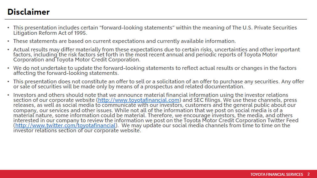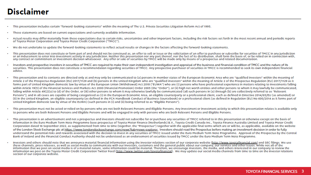 TOYOTA FINANCIAL SERVICES 2 Disclaimer • This presentation includes certain “forward - looking statements” within the meaning of The U.S. Private Securities Litigation Reform Act of 1995. • These statements are based on current expectations and currently available information. • Actual results may differ materially from these expectations due to certain risks, uncertainties and other important factors, including the risk factors set forth in the most recent annual and periodic reports of Toyota Motor Corporation and Toyota Motor Credit Corporation. • We do not undertake to update the forward - looking statements to reflect actual results or changes in the factors affecting the forward - looking statements. • This presentation does not constitute an offer to sell or a solicitation of an offer to purchase any securities. Any offer or sale of securities will be made only by means of a prospectus and related documentation. • Investors and others should note that we announce material financial information using the investor relations section of our corporate website ( http://www.toyotafinancial.com ) and SEC filings. We use these channels, press releases, as well as social media to communicate with our investors, customers and the general public about our company, our services and other issues. While not all of the information that we post on social media is of a material nature, some information could be material. Therefore, we encourage investors, the media, and others interested in our company to review the information we post on the Toyota Motor Credit Corporation Twitter Feed ( http://www.twitter.com/toyotafinancial ). We may update our social media channels from time to time on the investor relations section of our corporate website.