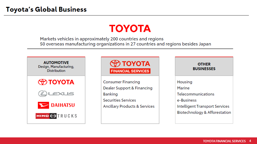 TOYOTA FINANCIAL SERVICES 3 Disclaimer • This presentation includes certain “forward - looking statements” within the meaning of The U.S. Private Securities Litigation Ref orm Act of 1995. • These statements are based on current expectations and currently available information. • Actual results may differ materially from these expectations due to certain risks, uncertainties and other important factors, in cluding the risk factors set forth in the most recent annual and periodic reports of Toyota Motor Corporation and Toyota Motor Credit Corporation (“TMCC”). • We do not undertake to update the forward - looking statements to reflect actual results or changes in the factors affecting the f orward - looking statements. • This presentation does not constitute or form part of and should not be construed as, an offer to sell or issue or the solici tat ion of an offer to purchase or subscribe for securities of TMCC in any jurisdiction or an inducement to enter into investment activity in any jurisdiction. Neither this presentation nor any part thereof, nor t he fact of its distribution, shall form the basis of, or be relied on in connection with, any contract or commitment or investment decision whatsoever. Any offer or sale of securities by TMCC will be made only by m ean s of a prospectus and related documentation. • Investors and prospective investors in securities of TMCC are required to make their own independent investigation and apprai sal of the business and financial condition of TMCC and the nature of its securities. This presentation does not constitute a recommendation regarding securities of TMCC. Any prospective purchaser of se curities in TMCC is recommended to seek its own independent financial advice. • This presentation and its contents are directed only at and may only be communicated to (a) persons in member states of the E uro pean Economic Area who are “qualified investors” within the meaning of Article 2 of the Prospectus Regulation (EU) 2017/1129 and (b) persons in the United Kingdom who are “qualified investors” wit hin the meaning of Article 2 of the Prospectus Regulation (EU) 2017/1129 as it forms part of United Kingdom domestic law by virtue of the European Union (Withdrawal) Act 2018 (“EUWA”) who are ( i ) persons who have professional experience in matters relating to investments falling within Article 19(5) of the Financial Services and Markets Act 2000 (Financial Promotion) Order 2005 (the “Order”), o r ( ii) high net worth entities and other persons to whom it may lawfully be communicated, falling within Article 49(2)(a) to (d) of the Order, or (iii) other persons to whom it may otherwise lawfully b e c ommunicated (all such persons in (a) through (b) are collectively referred to as “Relevant Persons”); and in all cases are capable of being categorized as ( i ) in the European Economic Area, an eligible counterparty or a professional client, each as defined in Directive 2014/65/EU (as amended) or (ii) in the United Kingdom, an eligible counterparty (as defined in the FCA Handbook Conduct of Business Sour ceb ook) or a professional client (as defined in Regulation (EU) No 600/2014 as it forms part of United Kingdom domestic law by virtue of the EUWA) (such persons in ( i ) and (ii) being referred to as “Eligible Persons”). • This presentation must not be acted or relied on by persons who are not both Relevant Persons and Eligible Persons. Any inves tme nt or investment activity to which this presentation relates is available only to persons who are both Relevant Persons and Eligible Persons and will be engaged in only with persons who are both Rele van t Persons and Eligible Persons. • This presentation is an advertisement and not a prospectus and investors should not subscribe for or purchase any securities of TMCC referred to in this presentation or otherwise except on the basis of information in the Euro Medium Term Note Programme base prospectus of Toyota Motor Finance (Netherlands) B.V., Toyota Credit Canada Inc., Toyota Finance Australia Limited and T oy ota Motor Credit Corporation dated 16 September 2022, as supplemented from time to time (together, the “Prospectus”) together with the applica ble final terms which are or will be, as applicable, available on the website of the London Stock Exchange plc at https://www.londonstockexchange.com/news?tab=news - explorer. Investors should read the Prospectus before making an investment decision in order to fully understand the potential risks and rewards associated with the decision to invest in any securities of TMCC issued unde r t he Euro Medium Term Note Programme . Approval of the Prospectus by the Central Bank of Ireland and the Financial Conduct Authority should not be understood as an endorsement of securities issued b y T MCC under the Euro Medium Term Note Programme . • Investors and others should note that we announce material financial information using the investor relations section of our cor porate website ( http://www.toyotafinancial.com ) and SEC filings. We use these channels, press releases, as well as social media to communicate with our investors, customers and the general public a bou t our company, our services and other issues. While not all of the information that we post on social media is of a material nature, some information could be material. Therefore, we encourage in vestors, the media, and others interested in our company to review the information we post on the Toyota Motor Credit Corporation Twitter Feed ( http://www.twitter.com/toyotafinancial ). We may update our social media channels from time to time on the investor relations section of our corporate website.