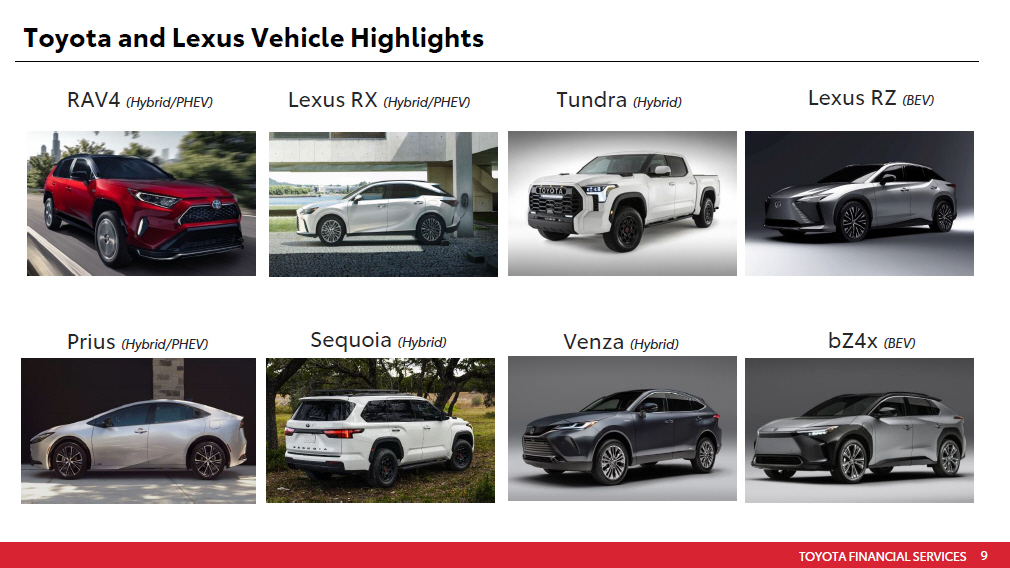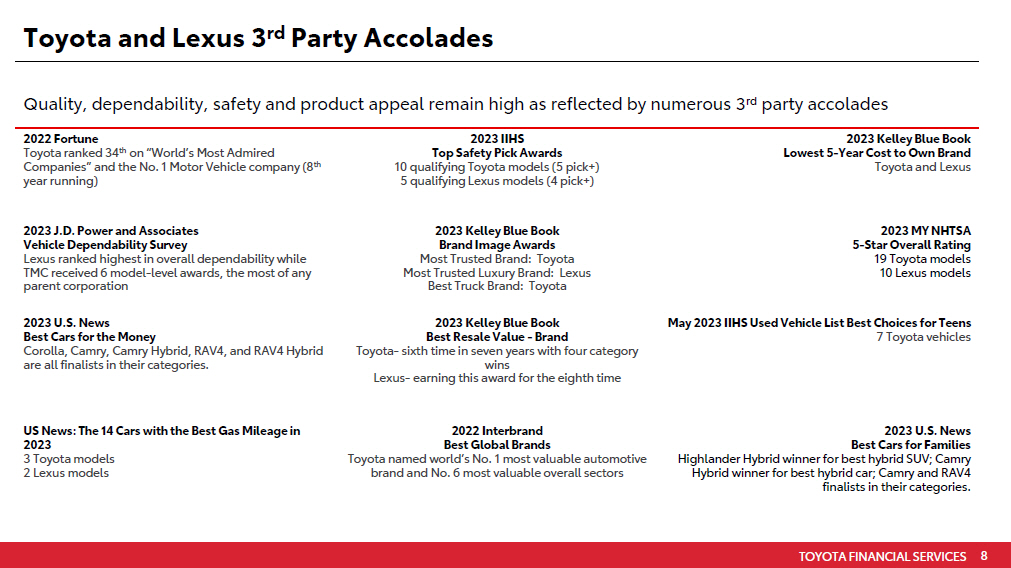 TOYOTA FINANCIAL SERVICES 8 Toyota and Lexus 3 rd Party Accolades Quality, dependability, safety and product appeal remain high as reflected by numerous 3 rd party accolades 2022 Fortune Toyota ranked 34 th on “World’s Most Admired Companies” and the No. 1 Motor Vehicle company (8 th year running) 2023 IIHS Top Safety Pick Awards 10 qualifying Toyota models (5 pick+) 5 qualifying Lexus models (4 pick+) 2023 Kelley Blue Book Lowest 5 - Year Cost to Own Brand Toyota and Lexus 2023 J.D. Power and Associates Vehicle Dependability Survey Lexus ranked highest in overall dependability while TMC received 6 model - level awards, the most of any parent corporation 2023 Kelley Blue Book Brand Image Awards Most Trusted Brand: Toyota Most Trusted Luxury Brand: Lexus Best Truck Brand: Toyota 2023 MY NHTSA 5 - Star Overall Rating 19 Toyota models 10 Lexus models 2023 U.S. News Best Cars for the Money Corolla, Camry, Camry Hybrid, RAV4, and RAV4 Hybrid are all finalists in their categories. 2023 Kelley Blue Book Best Resale Value - Brand Toyota - sixth time in seven years with four category wins Lexus - earning this award for the eighth time May 2023 IIHS Used Vehicle List Best Choices for Teens 7 Toyota vehicles US News: The 14 Cars with the Best Gas Mileage in 2023 3 Toyota models 2 Lexus models 2022 Interbrand Best Global Brands Toyota named world’s No. 1 most valuable automotive brand and No. 6 most valuable overall sectors 2023 U.S. News Best Cars for Families Highlander Hybrid winner for best hybrid SUV; Camry Hybrid winner for best hybrid car; Camry and RAV4 finalists in their categories.