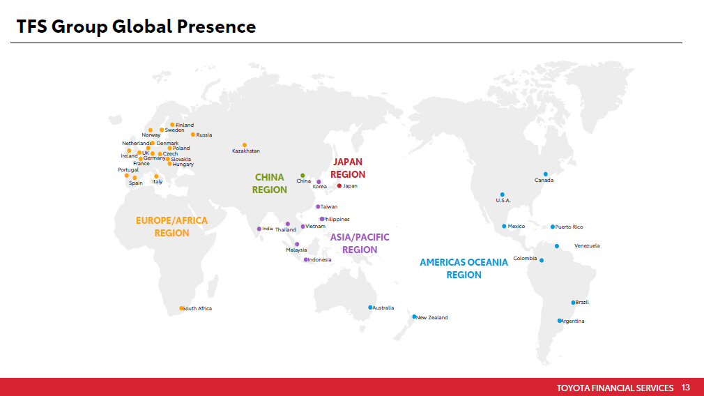 TOYOTA FINANCIAL SERVICES 13 TFS Group Global Presence JAPAN REGION EUROPE/AFRICA REGION CHINA REGION ASIA/PACIFIC REGION AMERICAS OCEANIA REGION Finland Sweden Norway Denmark Vietnam Netherlands Ireland Germany UK France Czech Poland Slovakia Hungary Portugal Spain Italy Kazakhstan China Korea Japa n Taiwan India Thailand Russia Philippines Malaysia Indonesia South Africa Australia New Zealand Argentina Brazil Venezuela Mexico Puerto Rico Canad a U.S.A. Colombia