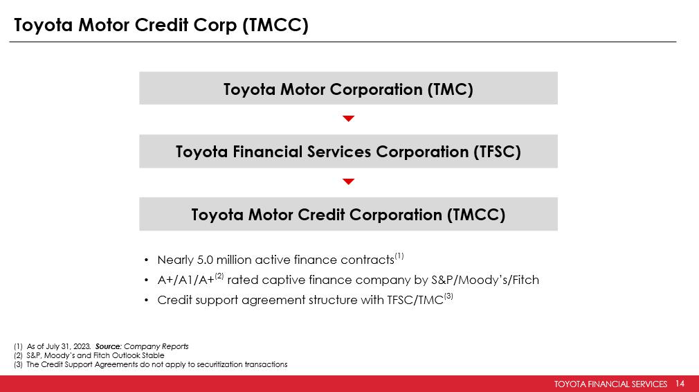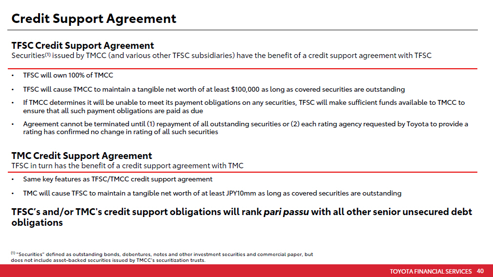 TOYOTA FINANCIAL SERVICES 40 Credit Support Agreement TFSC Credit Support Agreement Securities (1) issued by TMCC (and various other TFSC subsidiaries) have the benefit of a credit support agreement with TFSC • TFSC will own 100% of TMCC • TFSC will cause TMCC to maintain a tangible net worth of at least $100,000 as long as covered securities are outstanding • If TMCC determines it will be unable to meet its payment obligations on any securities, TFSC will make sufficient funds avail abl e to TMCC to ensure that all such payment obligations are paid as due • Agreement cannot be terminated until (1) repayment of all outstanding securities or (2) each rating agency requested by Toyot a t o provide a rating has confirmed no change in rating of all such securities TMC Credit Support Agreement TFSC in turn has the benefit of a credit support agreement with TMC • Same key features as TFSC/TMCC credit support agreement • TMC will cause TFSC to maintain a tangible net worth of at least JPY10mm as long as covered securities are outstanding TFSC’s and/or TMC's credit support obligations will rank pari passu with all other senior unsecured debt obligations (1) “Securities” defined as outstanding bonds, debentures, notes and other investment securities and commercial paper, but does not include asset - backed securities issued by TMCC’s securitization trusts.