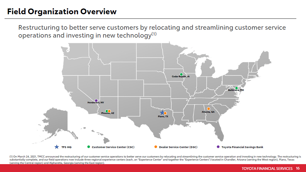 TOYOTA FINANCIAL SERVICES 16 Field Organization Overview TFS HQ Customer Service Center (CSC) Plano, TX Phoenix, AZ Cedar Rapids, IA Baltimore, MD Atlanta, GA Henderson, NV Dealer Service Center (DSC) Toyota Financial Savings Bank Restructuring to better serve customers by relocating and streamlining customer service operations and investing in new technology (1) (1) On March 24, 2021, TMCC announced the restructuring of our customer service operations to better serve our customers by r elo cating and streamlining the customer service operation and investing in new technology. The restructuring is substantially complete, and our field operations now include three regional experience centers (each, an "Ex per ience Center" and together the "Experience Centers") located in Chandler, Arizona (serving the West region), Plano, Texas (serving the Central region) and Alpharetta, Georgia (serving the East region).