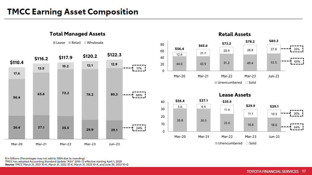 TOYOTA FINANCIAL SERVICES 17 TMCC Earning Asset Composition $ in billions (P ercentages may not add to 100% due to rounding) TMCC has adopted Accounting Standard Update “ASU” 2016 - 13 effective starting April 1, 2020 Source: TMCC March 31, 2021 10 - K, March 31, 2022 10 - K, March 31, 2023 10 - K, and June 30, 2023 10 - Q