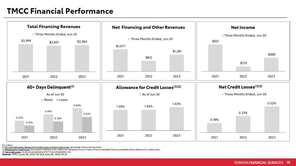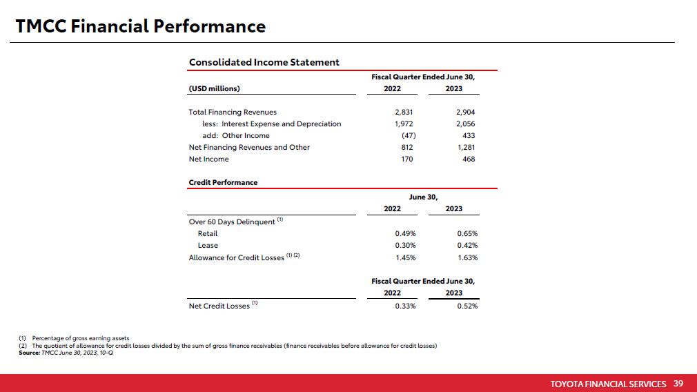 TOYOTA FINANCIAL SERVICES 39 TMCC Financial Performance (1) Percentage of gross earning assets (2) The quotient of allowance for credit losses divided by the sum of gross finance receivables (finance receivables before allow anc e for credit losses) Source : TMCC June 30, 2023, 10 - Q Consolidated Income Statement (USD millions) 2022 2023 Total Financing Revenues 2,831 2,904 less: Interest Expense and Depreciation 1,972 2,056 add: Other Income (47) 433 Net Financing Revenues and Other 812 1,281 Net Income 170 468 Credit Performance 2022 2023 Over 60 Days Delinquent (1) Retail 0.49% 0.65% Lease 0.30% 0.42% Allowance for Credit Losses (1) (2) 1.45% 1.63% 2022 2023 Net Credit Losses (1) 0.33% 0.52% Fiscal Quarter Ended June 30, June 30, Fiscal Quarter Ended June 30,