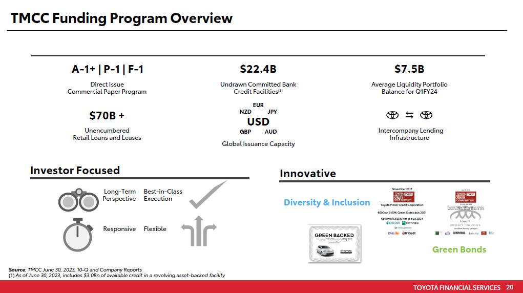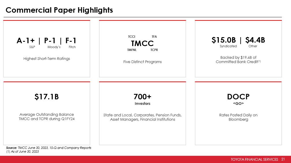 TOYOTA FINANCIAL SERVICES 20 TMCC Funding Program Overview Investor Focused Long - Term Perspective Best - in - Class Execution Responsive Flexible Innovative Diversity & Inclusion Green Bonds November 2017 Toyota Motor Credit Corporation €600mn 0.00% Green Notes due 2021 €600mn 0.625% Notes due 2024 Source : TMCC June 30 , 2023, 10 - Q and Company Reports (1) As of June 30 , 2023 , includes $3.0Bn of available credit in a revolving asset - backed facility P - 1 | A - 1+ | F - 1 . Direct Issue Commercial Paper Program $22.4B Undrawn Committed Bank Credit Facilities (1) $7.5B Average Liquidity Portfolio Balance for Q1FY24 $70B + Unencumbered Retail Loans and Leases EUR NZD JPY USD GBP AUD Global Issuance Capacity Intercompany Lending Infrastructure