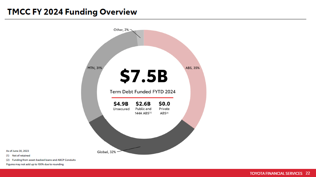 TOYOTA FINANCIAL SERVICES 22 TMCC FY 2024 Funding Overview As of June 30, 2023 (1) Net of retained (2) Funding from asset - backed loans and ABCP Conduits Figures may not add up to 100% due to rounding