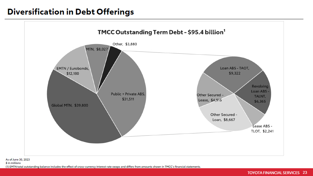 TOYOTA FINANCIAL SERVICES 23 Diversification in Debt Offerings As of June 30, 2023 $ in millions (1) EMTN total outstanding balance includes the effect of cross - currency interest rate swaps and differs from amounts shown in T MCC’s financial statements.