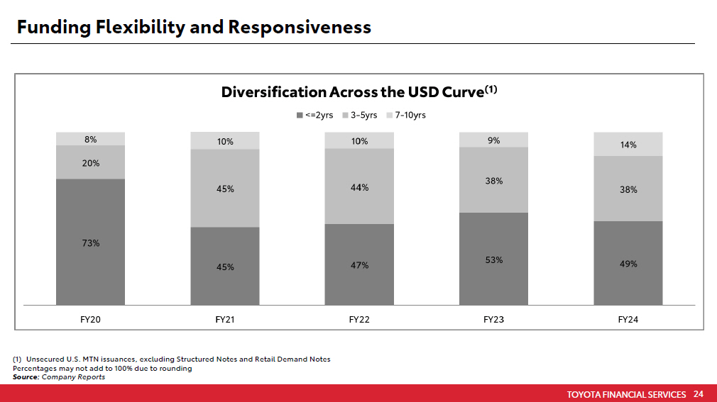 TOYOTA FINANCIAL SERVICES 24 Funding Flexibility and Responsiveness (1) Unsecured U.S. MTN issuances, excluding Structured Notes and Retail Demand Notes Percentages may not add to 100% due to rounding Source: Company Reports