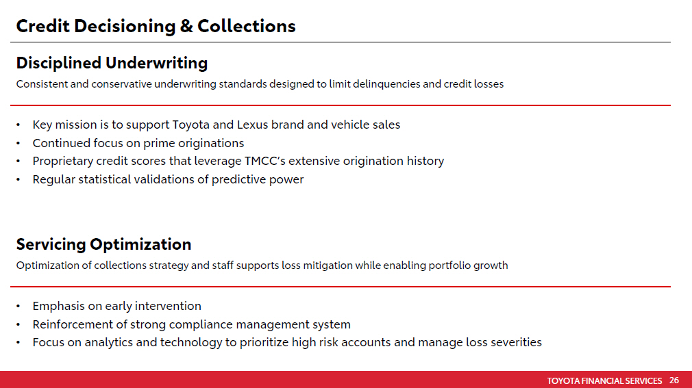 TOYOTA FINANCIAL SERVICES 26 Credit Decisioning & Collections Disciplined Underwriting Consistent and conservative underwriting standards designed to limit delinquencies and credit losses • Key mission is to support Toyota and Lexus brand and vehicle sales • Continued focus on prime originations • Proprietary credit scores that leverage TMCC’s extensive origination history • Regular statistical validations of predictive power Servicing Optimization Optimization of collections strategy and staff supports loss mitigation while enabling portfolio growth • Emphasis on early intervention • Reinforcement of strong compliance management system • Focus on analytics and technology to prioritize high risk accounts and manage loss severities