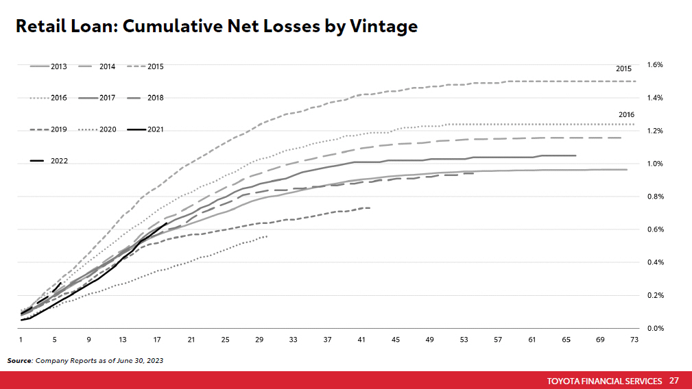 TOYOTA FINANCIAL SERVICES 27 Retail Loan: Cumulative Net Losses by Vintage Source : Company Reports as of June 30 , 2023