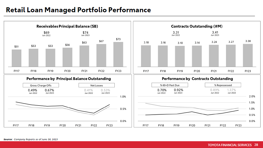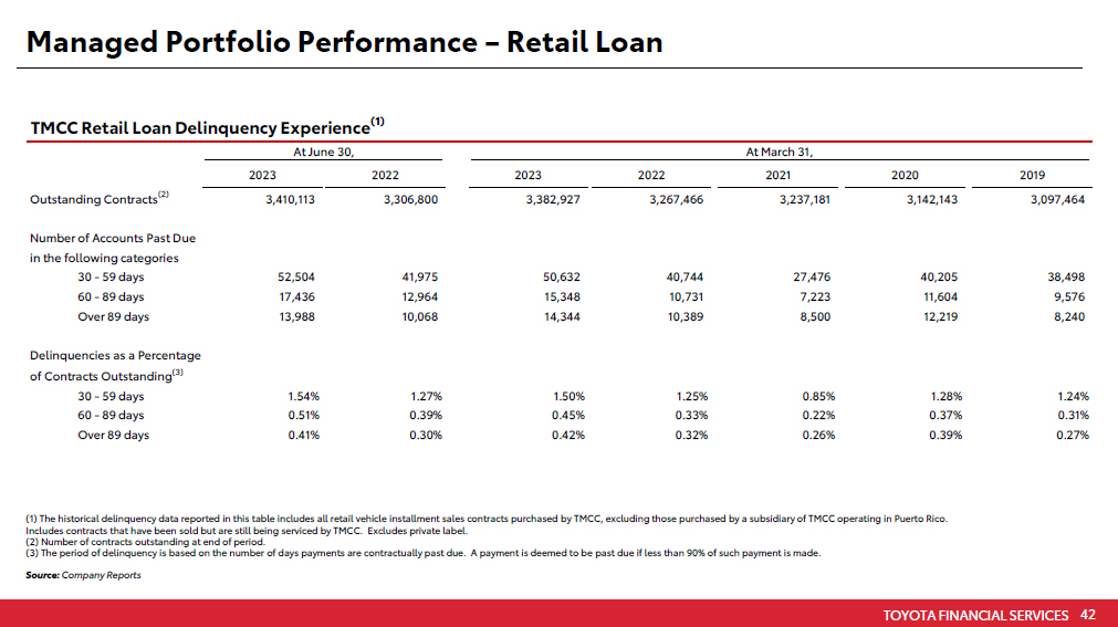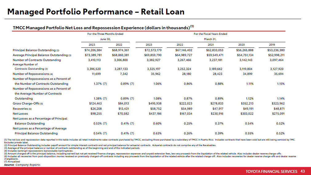 TOYOTA FINANCIAL SERVICES 43 Managed Portfolio Performance – Retail Loan (1) The net loss and repossession data reported in this table includes all retail installments sales contracts purchased by T MCC , excluding those purchased by a subsidiary of TMCC in Puerto Rico. Includes contracts that have been sold but are still bei ng serviced by TMC. Excludes private label. (2) Principal Balance Outstanding includes payoff amount for simple interest contracts and net principal balance for actuaria l c ontracts. Actuarial contracts do not comprise any of the Receivables. (3) Average of the principal balance or number of contracts outstanding as of the beginning and end of the indicated periods. (4) Includes bankrupt repossessions but excludes bankruptcies. (5) Amount charged off is the principal balance, including earned but not yet received finance charges, repossession expenses an d unpaid extension fees, less any proceeds from the liquidation of the related vehicle. Also includes dealer reserve charge - offs . (6) Includes all recoveries from post - disposition monies received on previously charged - off contracts including any proceeds fro m the liquidation of the related vehicle after the related charge - off. Also includes recoveries for dealer reserve charge - offs and dealer reserve chargebacks. (7) Annualized Source : Company Reports 2023 2022 2023 2022 2021 2020 2019 Principal Balance Outstanding (2) $74,206,384 $68,974,361 $72,573,179 $67,146,402 $62,833,053 $56,265,888 $53,236,380 Average Principal Balance Outstanding (3) $73,389,781 $68,060,381 $69,859,790 $64,989,727 $59,549,471 $54,751,134 $52,998,211 Number of Contracts Outstanding 3,410,113 3,306,800 3,382,927 3,267,466 3,237,181 3,142,143 3,097,464 Average Number of Contracts Outstanding (3) 3,396,520 3,287,133 3,325,197 3,252,324 3,189,662 3,119,804 3,127,920 Number of Repossessions (4) 11,699 7,342 35,962 28,180 28,423 34,899 35,694 Number of Repossessions as a Percent of the Number of Contracts Outstanding 1.37%(7) 0.89%(7) 1.06% 0.86% 0.88% 1.11% 1.15% Number of Repossessions as a Percent of the Average Number of Contracts Outstanding 1.38%(7) 0.89%(7) 1.08% 0.87% 0.89% 1.12% 1.14% Gross Charge-Offs (5) $124,463 $84,013 $495,938 $222,023 $278,833 $352,213 $323,962 Recoveries (6) $26,208 $13,431 $58,752 $54,989 $47,917 $49,191 $48,871 Net Losses $98,255 $70,582 $437,186 $167,034 $230,916 $303,022 $275,091 Net Losses as a Percentage of Principal Balance Outstanding 0.53%(7) 0.41%(7) 0.60% 0.25% 0.37% 0.54% 0.52% Net Losses as a Percentage of Average Principal Balance Outstanding 0.54%(7) 0.41%(7) 0.63% 0.26% 0.39% 0.55% 0.52% TMCC Managed Portfolio Net Loss and Repossession Experience (dollars in thousands) (1) For the Three Months Ended June 30, For the Fiscal Years Ended March 31,