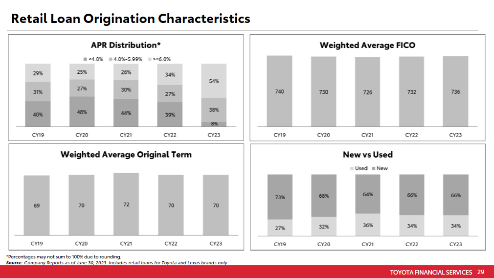 TOYOTA FINANCIAL SERVICES 29 Retail Loan Origination Characteristics *Percentages may not sum to 100% due to rounding . Source: Company Reports as of June 30, 2023. Includes retail loans for Toyota and Lexus brands only