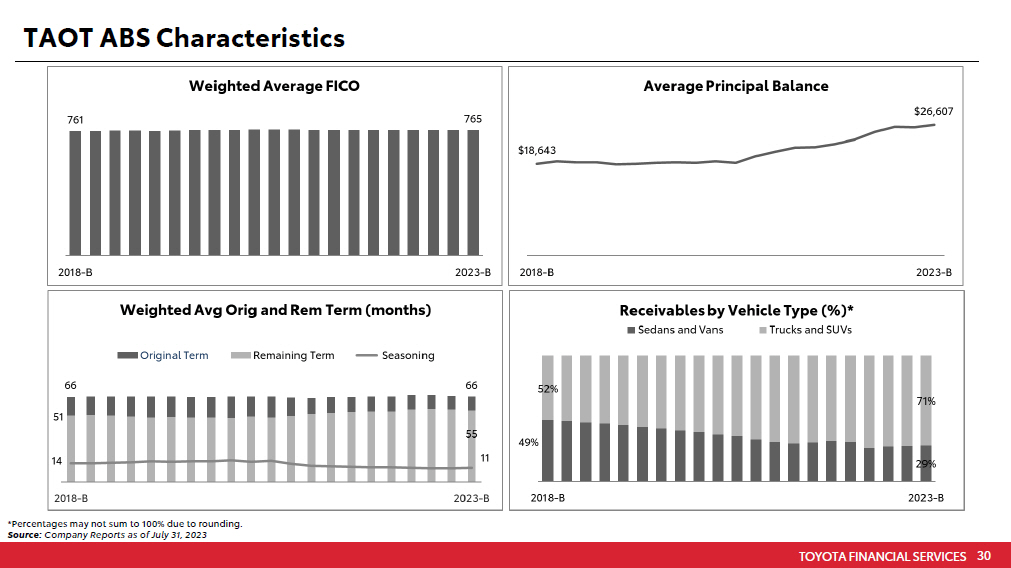 TOYOTA FINANCIAL SERVICES 30 TAOT ABS Characteristics *Percentages may not sum to 100% due to rounding . Source: Company Reports as of July 31, 2023