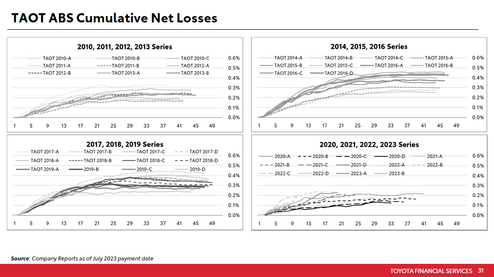 TOYOTA FINANCIAL SERVICES 31 TAOT ABS Cumulative Net Losses Source : Company Reports as of July 2023 payment date