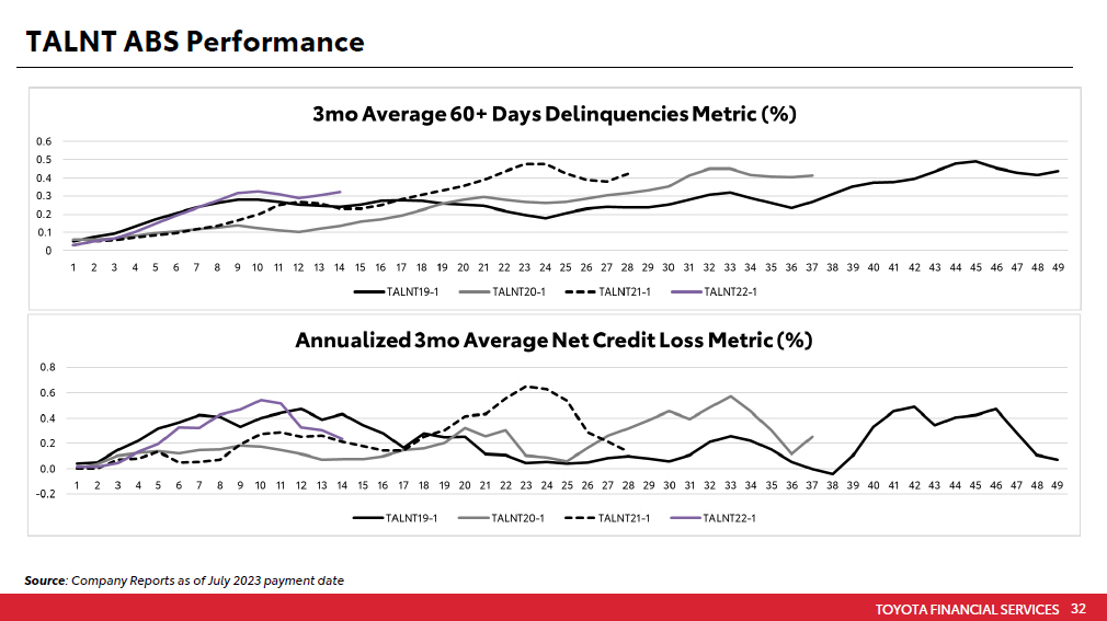 TOYOTA FINANCIAL SERVICES 32 TALNT ABS Performance Source : Company Reports as of July 2023 payment date