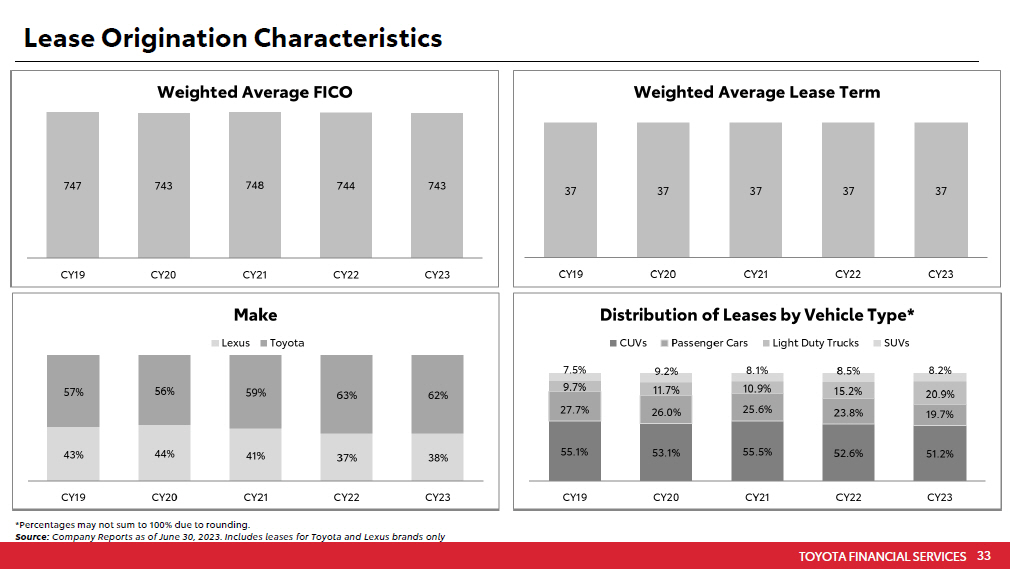 TOYOTA FINANCIAL SERVICES 33 Lease Origination Characteristics *Percentages may not sum to 100% due to rounding . Source: Company Reports as of June 30, 2023. Includes leases for Toyota and Lexus brands only