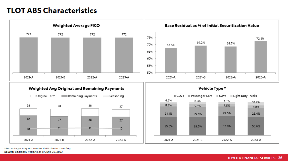 TOYOTA FINANCIAL SERVICES 36 TLOT ABS Characteristics *Percentages may not sum to 100% due to rounding Source: Company Reports as of June 30, 2023