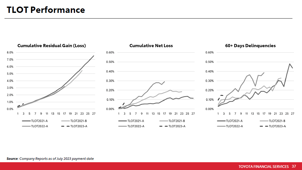 TOYOTA FINANCIAL SERVICES 37 TLOT Performance Source : Company Reports as of July 2023 payment date