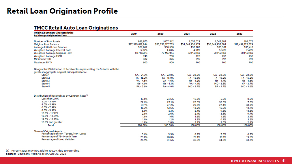 TOYOTA FINANCIAL SERVICES 41 Retail Loan Origination Profile (1) Percentages may not add to 100.0% due to rounding. Source: Company Reports as of June 30, 2023 TMCC Retail Auto Loan Originations Original Summary Characteristics by Vintage Origination Year: 2019 2020 2021 2022 2023 Number of Pool Assets 948,970 1,007,542 1,053,629 1,043,884 494,072 Original Pool Balance $27,579,012,944 $30,738,117,735 $34,544,936,474 $36,849,953,504 $17,499,175,079 Average Initial Loan Balance $29,062 $30,508 $32,787 $35,301 $35,418 Weighted Average Interest Rate 5.02% 4.48% 4.91% 5.59% 7.46% Weighted Average Original Term 69 Months 70 Months 72 Months 70 Months 70 Months Weighted Average FICO 740 730 726 732 736 Minimum FICO 382 376 395 397 392 Maximum FICO 900 900 900 900 900 Geographic Distribution of Receivables representing the 5 states with the greatest aggregate original principal balance: State 1 CA - 21.3% CA - 22.0% CA - 23.2% CA - 23.0% CA - 22.0% State 2 TX - 15.2% TX - 15.0% TX - 15.6% TX - 16.2% TX - 15.2% State 3 VA - 4.5% VA - 4.6% NY - 4.2% NY - 4.4% NY - 4.6% State 4 NY - 4.0% NY - 4.1% VA - 4.1% MD - 3.8% VA - 3.7% State 5 PA - 3.9% PA - 4.0% MD - 3.9% PA - 3.7% MD - 3.6% Distribution of Receivables by Contract Rate: (1) Less than 2.0% 17.6% 24.6% 16.3% 5.9% 0.5% 2.0% - 3.99% 22.6% 23.1% 28.0% 32.8% 7.0% 4.0% - 5.99% 31.1% 27.2% 29.7% 27.4% 38.2% 6.0% - 7.99% 15.3% 12.6% 13.2% 15.9% 18.7% 8.0% - 9.99% 6.0% 5.1% 5.4% 9.6% 18.8% 10.0% - 11.99% 2.8% 2.6% 2.4% 3.8% 9.7% 12.0% - 13.99% 1.8% 1.6% 1.6% 1.6% 3.4% 14.0% - 15.99% 1.0% 1.2% 1.2% 0.9% 1.2% 16.0% and greater 1.8% 2.0% 2.1% 2.0% 2.4% Total 100.00% 100.00% 100.00% 100.00% 100.00% Share of Original Assets: Percentage of Non - Toyota/Non - Lexus 3.6% 5.9% 8.2% 7.3% 6.2% Percentage of 75+ Month Term 23.0% 28.0% 29.1% 19.1% 19.5% Percentage of Used Vehicles 26.9% 31.6% 36.5% 34.3% 33.7%