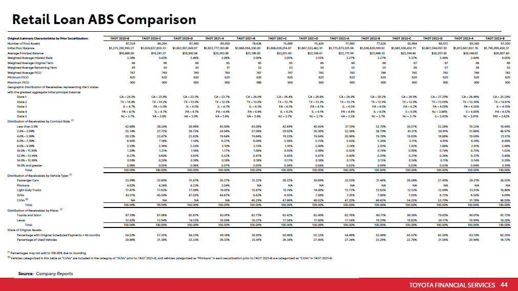 TOYOTA FINANCIAL SERVICES 44 Source : Company Reports Retail Loan ABS Comparison Original Summary Characteristics by Prior Securitization: TAOT 2020-B TAOT 2020-C TAOT 2020-D TAOT 2021-A TAOT 2021-B TAOT 2021-C TAOT 2021-D TAOT 2022-A TAOT 2022-B TAOT 2022-C TAOT 2022-D TAOT 2023-A TAOT 2023-B Number of Pool Assets 67,524 86,264 87,460 89,958 78,636 75,689 75,426 77,985 77,626 65,964 68,972 69,360 67,500 Initial Pool Balance $1,275,392,995.27 $1,659,837,859.33 $1,652,997,849.97 $1,822,777,183.00 $1,666,956,330.00 $1,666,028,014.87 $1,667,553,462.91 $1,775,873,551.06 $1,836,639,189.92 $1,661,936,432.71 $1,807,594,097.92 $1,813,667,857.76 $1,795,999,450.37 Average Principal Balance $18,888.00 $19,241.37 $18,900.04 $20,263.00 $21,198.00 $22,011.49 $22,108.47 $22,771.99 $23,660.10 $25,194.60 $26,207.65 $26,148.61 $26,607.40 Weighted Average Interest Rate 3.26% 3.43% 3.46% 3.06% 3.08% 3.05% 3.15% 3.27% 3.27% 3.37% 3.44% 3.64% 4.05% Weighted Average Original Term 66 66 66 65 65 65 66 66 66 67 67 66 66 Weighted Average Remaining Term 49 50 50 51 53 53 54 55 55 56 57 56 55 Weighted Average FICO 767 769 769 769 767 767 765 765 766 765 765 766 765 Minimum FICO 620 620 620 620 620 620 620 620 620 620 620 620 620 Maximum FICO 900 900 900 900 900 900 900 900 900 900 900 900 900 Geographic Distribution of Receivables representing the 5 states with the greatest aggregate Initial principal balance: State 1 CA – 24.2% CA – 23.8% CA – 23.3% CA – 23.7% CA – 26.0% CA – 26.4% CA – 26.8% CA – 26.9% CA – 28.2% CA – 26.9% CA – 27.29% CA – 26.46% CA – 25.24% State 2 TX – 14.8% TX – 14.2% TX – 13.9% TX – 12.5% TX – 13.0% TX – 12.7% TX – 13.3% TX – 13.7% TX – 12.9% TX – 12.9% TX – 13.09% TX – 13.30% TX – 14.61% State 3 IL – 4.7% PA – 5.0% IL – 4.5% IL – 4.7% IL – 4.5% PA – 4.3% PA – 4.1% IL – 4.5% PA – 4.0% PA – 4.2% PA – 4.09% PA – 4.35% IL – 4.15% State 4 PA – 4.1% IL – 4.7% PA – 4.1% PA – 4.4% PA – 4.4% IL – 4.2% IL – 4.1% PA – 4.4% IL – 4.0% Il – 4.0% NJ – 3.86% Il – 4.00% PA – 4.12% State 5 NJ – 3.7% VA – 3.8% VA – 3.9% VA – 3.8% VA – 3.6% NJ – 3.7% NJ – 3.7% VA – 3.5% NJ – 3.7% NJ – 3.7% Il – 3.83% NJ – 3.81% MD – 3.62% Distribution of Receivables by Contract Rate: (1) MD – 3.62% Less than 2.0% 42.68% 38.24% 36.96% 45.00% 43.08% 42.69% 40.45% 37.10% 32.70% 30.57% 22.28% 19.25% 18.44% 2.0% - 3.99% 25.74% 27.72% 28.73% 24.94% 27.06% 29.02% 30.30% 32.36% 38.79% 41.21% 50.81% 51.68% 46.97% 4.0% - 5.99% 20.33% 22.47% 22.83% 19.64% 19.84% 19.23% 19.84% 20.96% 19.78% 19.83% 18.88% 19.58% 21.51% 6.0% - 7.99% 6.95% 7.16% 7.14% 6.37% 6.08% 5.56% 5.75% 5.92% 5.34% 5.11% 4.91% 6.18% 8.40% 8.0% - 9.99% 2.29% 2.36% 2.33% 2.10% 2.15% 1.91% 2.00% 2.14% 2.03% 1.92% 1.88% 2.01% 2.96% 10.0% - 11.99% 1.20% 1.21% 1.16% 1.17% 1.08% 0.93% 0.98% 0.92% 0.78% 0.90% 0.74% 0.75% 1.02% 12.0% - 13.99% 0.57% 0.60% 0.61% 0.53% 0.47% 0.45% 0.47% 0.40% 0.39% 0.31% 0.36% 0.37% 0.40% 14.0% - 15.99% 0.18% 0.20% 0.18% 0.18% 0.18% 0.17% 0.18% 0.17% 0.15% 0.14% 0.11% 0.14% 0.20% 16.0% and greater 0.06% 0.05% 0.06% 0.07% 0.05% 0.04% 0.04% 0.02% 0.04% 0.03% 0.03% 0.04% 0.10% Total 100.00% 100.00% 100.00% 100.00% 100.00% 100.00% 100.00% 100.00% 100.00% 100.00% 100.00% 100.00% 100.00% Distribution of Receivables by Vehicle Type: (1) Passenger Cars 33.99% 32.60% 31.67% 30.27% 31.22% 30.22% 30.89% 32.03% 31.46% 26.58% 27.49% 28.21% 28.55% Minivans 4.83% 4.26% 4.22% 3.04% NA NA NA NA NA NA NA NA NA Light Duty Trucks 17.87% 17.63% 17.08% 16.81% 15.87% 15.19% 14.00% 13.77% 12.83% 12.12% 12.09% 13.51% 16.86% SUVs 43.31% 45.50% 47.03% 49.87% 6.63% 6.93% 7.08% 7.01% 7.06% 7.05% 6.72% 6.50% 6.09% CUVs (2) NA NA NA NA 46.29% 47.66% 48.02% 47.20% 48.65% 54.25% 53.70% 51.78% 48.50% Total 100.00% 99.99% 100.00% 100.00% 100.00% 100.00% 100.00% 100.00% 100.00% 100.00% 100.00% 100.00% 100.00% Distribution of Receivables by Make: (1) Toyota and Scion 87.18% 87.06% 85.87% 83.91% 83.73% 82.42% 82.40% 82.76% 80.71% 80.18% 79.83% 80.01% 81.72% Lexus 12.82% 12.94% 14.13% 16.09% 16.27% 17.58% 17.60% 17.24% 19.29% 19.82% 20.17% 19.99% 18.28% Total 100.00% 100.00% 100.00% 100.00% 100.00% 100.00% 100.00% 100.00% 100.00% 100.00% 100.00% 100.00% 100.00% Share of Original Assets: Percentage with Original Scheduled Payments > 60 months 54.52% 57.35% 56.23% 49.18% 50.61% 50.46% 52.33% 54.48% 55.04% 65.07% 65.50% 63.10% 62.35% Percentage of Used Vehicles 20.86% 21.38% 23.33% 26.33% 25.41% 26.34% 27.45% 27.34% 23.26% 22.78% 21.56% 20.94% 18.72% (1) Percentages may not add to 100.00% due to rounding (2) Vehicles categorized in this table as “CUVs” are included in the category of “SUVs” prior to TAOT 2021-B, and vehicles categorized as “Minivans” in each securitization prior to TAOT 2021-B are categorized as “CUVs” in TAOT 2021-B.