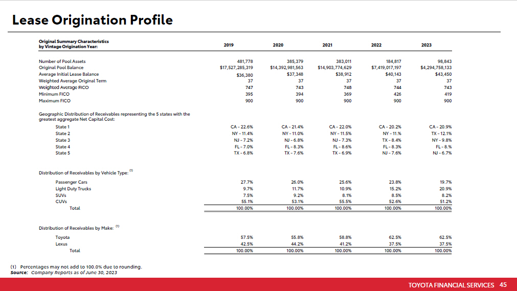 TOYOTA FINANCIAL SERVICES 45 Lease Origination Profile (1) Percentages may not add to 100.0% due to rounding. Source: Company Reports as of June 30, 2023 Original Summary Characteristics by Vintage Origination Year: 2019 2020 2021 2022 2023 Number of Pool Assets 481,778 385,379 383,011 184,817 98,843 Original Pool Balance $17,527,285,319 $14,392,981,563 $14,903,774,629 $7,419,017,197 $4,294,758,133 Average Initial Lease Balance $36,380 $37,348 $38,912 $40,143 $43,450 Weighted Average Original Term 37 37 37 37 37 Weighted Average FICO 747 743 748 744 743 Minimum FICO 395 394 369 426 419 Maximum FICO 900 900 900 900 900 Geographic Distribution of Receivables representing the 5 states with the greatest aggregate Net Capital Cost: State 1 CA - 22.6% CA - 21.4% CA - 22.0% CA - 20.2% CA - 20.9% State 2 NY - 11.4% NY - 11.0% NY - 11.5% NY - 11.% TX - 12.1% State 3 NJ - 7.2% NJ - 6.8% NJ - 7.3% TX - 8.4% NY - 9.8% State 4 FL - 7.0% FL - 8.3% FL - 8.6% FL - 8.3% FL - 8.% State 5 TX - 6.8% TX - 7.6% TX - 6.9% NJ - 7.6% NJ - 6.7% Distribution of Receivables by Vehicle Type: (1) Passenger Cars 27.7% 26.0% 25.6% 23.8% 19.7% Light Duty Trucks 9.7% 11.7% 10.9% 15.2% 20.9% SUVs 7.5% 9.2% 8.1% 8.5% 8.2% CUVs 55.1% 53.1% 55.5% 52.6% 51.2% Total 100.00% 100.00% 100.00% 100.00% 100.00% Distribution of Receivables by Make: (1) Toyota 57.5% 55.8% 58.8% 62.5% 62.5% Lexus 42.5% 44.2% 41.2% 37.5% 37.5% Total 100.00% 100.00% 100.00% 100.00% 100.00%