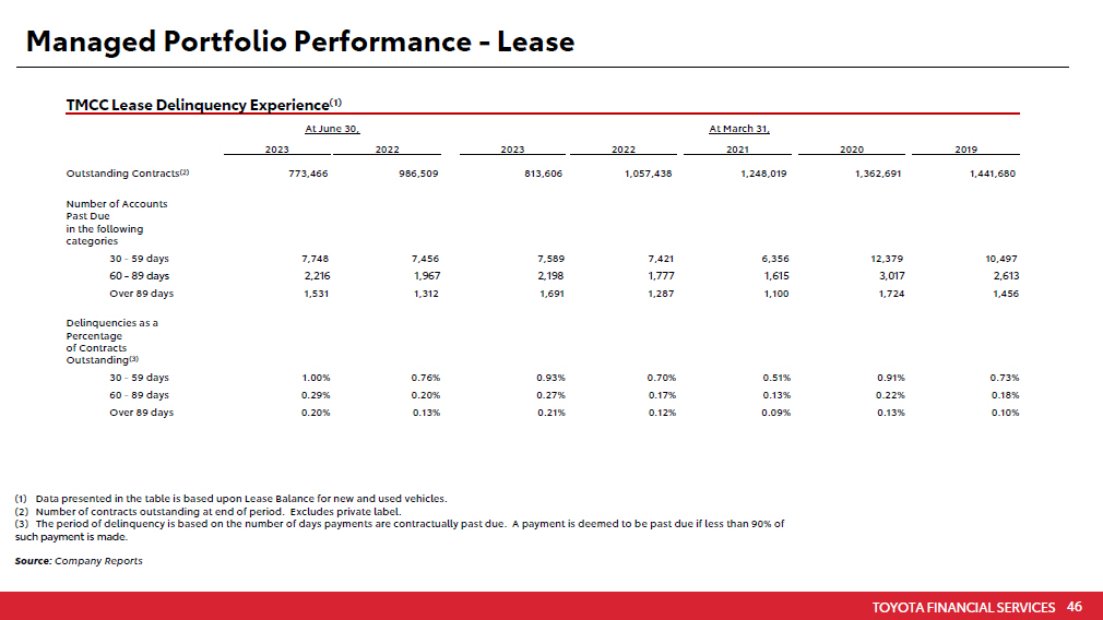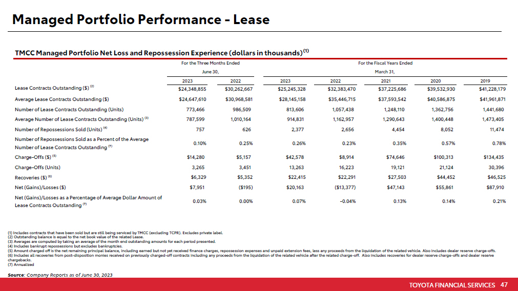 TOYOTA FINANCIAL SERVICES 46 Managed Portfolio Performance - Lease (1) Data presented in the table is based upon Lease Balance for new and used vehicles. (2) Number of contracts outstanding at end of period. Excludes private label. (3) The period of delinquency is based on the number of days payments are contractually past due. A payment is deemed to b e p ast due if less than 90% of such payment is made. Source: Company Reports TMCC Lease Delinquency Experience (1) At June 30, At March 31, 2023 2022 2023 2022 2021 2020 2019 Outstanding Contracts (2) 773,466 986,509 813,606 1,057,438 1,248,019 1,362,691 1,441,680 Number of Accounts Past Due in the following categories 30 - 59 days 7,748 7,456 7,589 7,421 6,356 12,379 10,497 60 - 89 days 2,216 1,967 2,198 1,777 1,615 3,017 2,613 Over 89 days 1,531 1,312 1,691 1,287 1,100 1,724 1,456 Delinquencies as a Percentage of Contracts Outstanding (3) 30 - 59 days 1.00% 0.76% 0.93% 0.70% 0.51% 0.91% 0.73% 60 - 89 days 0.29% 0.20% 0.27% 0.17% 0.13% 0.22% 0.18% Over 89 days 0.20% 0.13% 0.21% 0.12% 0.09% 0.13% 0.10%