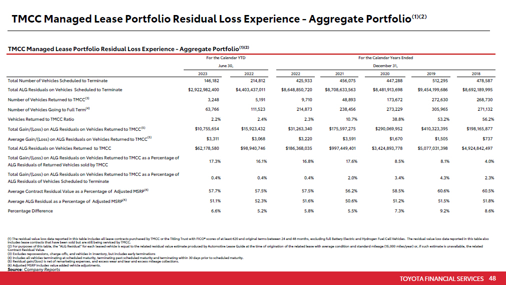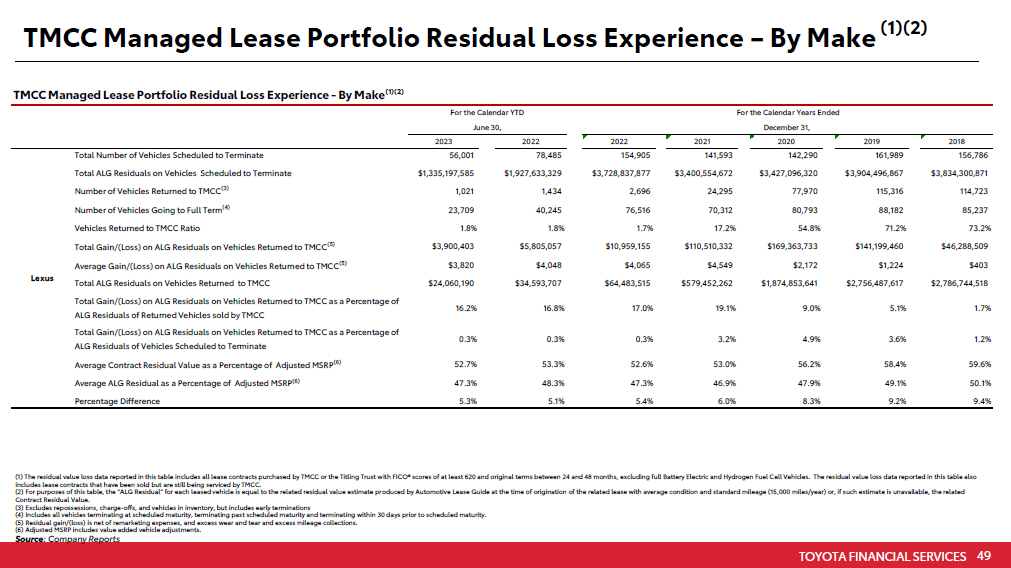 TOYOTA FINANCIAL SERVICES 48 TMCC Managed Lease Portfolio Residual Loss Experience - Aggregate Portfolio (1)(2) (1) The residual value loss data reported in this table includes all lease contracts purchased by TMCC or the Titling Trust w ith FICO® scores of at least 620 and original terms between 24 and 48 months, excluding full Battery Electric and Hydrogen Fuel C el l Vehicles. The residual value loss data reported in this table also includes lease contracts that have been sold but are still being serviced by TMCC. (2) For purposes of this table, the “ALG Residual” for each leased vehicle is equal to the related residual value estimate pr odu ced by Automotive Lease Guide at the time of origination of the related lease with average condition and standard mileage (15 ,00 0 miles/year) or, if such estimate is unavailable, the related Contract Residual Value. (3) Excludes repossessions, charge - offs, and vehicles in inventory, but includes early terminations (4) Includes all vehicles terminating at scheduled maturity, terminating past scheduled maturity and terminating within 30 da ys prior to scheduled maturity. (5) Residual gain/(loss) is net of remarketing expenses, and excess wear and tear and excess mileage collections. (6) Adjusted MSRP includes value added vehicle adjustments. Source : Company Reports 2023 2022 2022 2021 2020 2019 2018 Total Number of Vehicles Scheduled to Terminate 146,182 214,812 425,933 456,075 447,288 512,295 478,587 Total ALG Residuals on Vehicles Scheduled to Terminate $2,922,982,400 $4,403,437,011 $8,648,850,720 $8,708,633,563 $8,481,913,698 $9,454,199,686 $8,692,189,995 Number of Vehicles Returned to TMCC (3) 3,248 5,191 9,710 48,893 173,672 272,630 268,730 Number of Vehicles Going to Full Term (4) 63,766 111,523 214,873 238,456 273,229 305,965 271,132 Vehicles Returned to TMCC Ratio 2.2% 2.4% 2.3% 10.7% 38.8% 53.2% 56.2% Total Gain/(Loss) on ALG Residuals on Vehicles Returned to TMCC (5) $10,755,654 $15,923,432 $31,263,340 $175,597,275 $290,069,952 $410,323,395 $198,165,877 Average Gain/(Loss) on ALG Residuals on Vehicles Returned to TMCC (5) $3,311 $3,068 $3,220 $3,591 $1,670 $1,505 $737 Total ALG Residuals on Vehicles Returned to TMCC $62,178,580 $98,940,746 $186,368,035 $997,449,401 $3,424,893,778 $5,077,031,398 $4,924,842,497 Total Gain/(Loss) on ALG Residuals on Vehicles Returned to TMCC as a Percentage of ALG Residuals of Returned Vehicles sold by TMCC 17.3% 16.1% 16.8% 17.6% 8.5% 8.1% 4.0% Total Gain/(Loss) on ALG Residuals on Vehicles Returned to TMCC as a Percentage of ALG Residuals of Vehicles Scheduled to Terminate 0.4% 0.4% 0.4% 2.0% 3.4% 4.3% 2.3% Average Contract Residual Value as a Percentage of Adjusted MSRP (6) 57.7% 57.5% 57.5% 56.2% 58.5% 60.6% 60.5% Average ALG Residual as a Percentage of Adjusted MSRP (6) 51.1% 52.3% 51.6% 50.6% 51.2% 51.5% 51.8% Percentage Difference 6.6% 5.2% 5.8% 5.5% 7.3% 9.2% 8.6% TMCC Managed Lease Portfolio Residual Loss Experience - Aggregate Portfolio (1)(2) For the Calendar YTD For the Calendar Years Ended June 30, December 31,