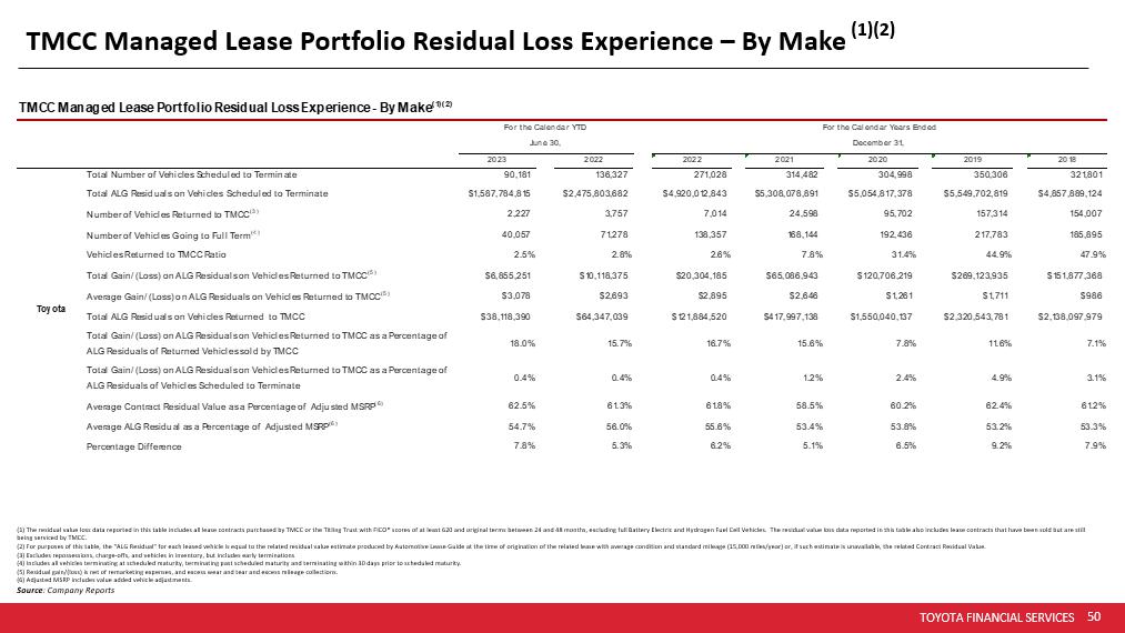 TOYOTA FINANCIAL SERVICES 49 TMCC Managed Lease Portfolio Residual Loss Experience – By Make (1)(2) (1) The residual value loss data reported in this table includes all lease contracts purchased by TMCC or the Titling Trust w ith FICO® scores of at least 620 and original terms between 24 and 48 months, excluding full Battery Electric and Hydrogen Fuel C el l Vehicles. The residual value loss data reported in this table also includes lease contracts that have been sold but are still being serviced by TMCC. (2) For purposes of this table, the “ALG Residual” for each leased vehicle is equal to the related residual value estimate pr odu ced by Automotive Lease Guide at the time of origination of the related lease with average condition and standard mileage (15 ,00 0 miles/year) or, if such estimate is unavailable, the related Contract Residual Value. (3) Excludes repossessions, charge - offs, and vehicles in inventory, but includes early terminations (4) Includes all vehicles terminating at scheduled maturity, terminating past scheduled maturity and terminating within 30 da ys prior to scheduled maturity. (5) Residual gain/(loss) is net of remarketing expenses, and excess wear and tear and excess mileage collections. (6) Adjusted MSRP includes value added vehicle adjustments. Source : Company Reports 2023 2022 2022 2021 2020 2019 2018 Total Number of Vehicles Scheduled to Terminate 56,001 78,485 154,905 141,593 142,290 161,989 156,786 Total ALG Residuals on Vehicles Scheduled to Terminate $1,335,197,585 $1,927,633,329 $3,728,837,877 $3,400,554,672 $3,427,096,320 $3,904,496,867 $3,834,300,871 Number of Vehicles Returned to TMCC (3) 1,021 1,434 2,696 24,295 77,970 115,316 114,723 Number of Vehicles Going to Full Term (4) 23,709 40,245 76,516 70,312 80,793 88,182 85,237 Vehicles Returned to TMCC Ratio 1.8% 1.8% 1.7% 17.2% 54.8% 71.2% 73.2% Total Gain/(Loss) on ALG Residuals on Vehicles Returned to TMCC (5) $3,900,403 $5,805,057 $10,959,155 $110,510,332 $169,363,733 $141,199,460 $46,288,509 Average Gain/(Loss) on ALG Residuals on Vehicles Returned to TMCC (5) $3,820 $4,048 $4,065 $4,549 $2,172 $1,224 $403 Total ALG Residuals on Vehicles Returned to TMCC $24,060,190 $34,593,707 $64,483,515 $579,452,262 $1,874,853,641 $2,756,487,617 $2,786,744,518 Total Gain/(Loss) on ALG Residuals on Vehicles Returned to TMCC as a Percentage of ALG Residuals of Returned Vehicles sold by TMCC 16.2% 16.8% 17.0% 19.1% 9.0% 5.1% 1.7% Total Gain/(Loss) on ALG Residuals on Vehicles Returned to TMCC as a Percentage of ALG Residuals of Vehicles Scheduled to Terminate 0.3% 0.3% 0.3% 3.2% 4.9% 3.6% 1.2% Average Contract Residual Value as a Percentage of Adjusted MSRP (6) 52.7% 53.3% 52.6% 53.0% 56.2% 58.4% 59.6% Average ALG Residual as a Percentage of Adjusted MSRP (6) 47.3% 48.3% 47.3% 46.9% 47.9% 49.1% 50.1% Percentage Difference 5.3% 5.1% 5.4% 6.0% 8.3% 9.2% 9.4% TMCC Managed Lease Portfolio Residual Loss Experience - By Make (1)(2) Lexus For the Calendar YTD For the Calendar Years Ended June 30, December 31,