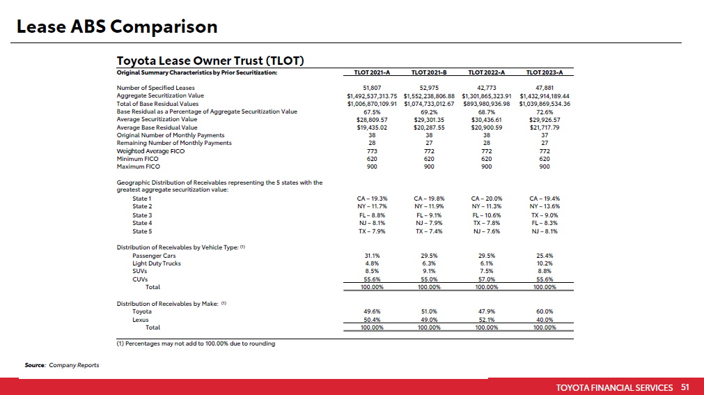 TOYOTA FINANCIAL SERVICES 51 Source : Company Reports Lease ABS Comparison Toyota Lease Owner Trust (TLOT) Original Summary Characteristics by Prior Securitization: TLOT 2021 - A TLOT 2021 - B TLOT 2022 - A TLOT 2023 - A Number of Specified Leases 51,807 52,975 42,773 47,881 Aggregate Securitization Value $1,492,537,313.75 $1,552,238,806.88 $1,301,865,323.91 $1,432,914,189.44 Total of Base Residual Values $1,006,870,109.91 $1,074,733,012.67 $893,980,936.98 $1,039,869,534.36 Base Residual as a Percentage of Aggregate Securitization Value 67.5% 69.2% 68.7% 72.6% Average Securitization Value $28,809.57 $29,301.35 $30,436.61 $29,926.57 Average Base Residual Value $19,435.02 $20,287.55 $20,900.59 $21,717.79 Original Number of Monthly Payments 38 38 38 37 Remaining Number of Monthly Payments 28 27 28 27 Weighted Average FICO 773 772 772 772 Minimum FICO 620 620 620 620 Maximum FICO 900 900 900 900 Geographic Distribution of Receivables representing the 5 states with the greatest aggregate securitization value: State 1 CA – 19.3% CA – 19.8% CA – 20.0% CA – 19.4% State 2 NY – 11.7% NY – 11.9% NY – 11.3% NY – 13.6% State 3 FL – 8.8% FL – 9.1% FL – 10.6% TX – 9.0% State 4 NJ – 8.1% NJ – 7.9% TX – 7.8% FL – 8.3% State 5 TX – 7.9% TX – 7.4% NJ – 7.6% NJ – 8.1% Distribution of Receivables by Vehicle Type: (1) Passenger Cars 31.1% 29.5% 29.5% 25.4% Light Duty Trucks 4.8% 6.3% 6.1% 10.2% SUVs 8.5% 9.1% 7.5% 8.8% CUVs 55.6% 55.0% 57.0% 55.6% Total 100.00% 100.00% 100.00% 100.00% Distribution of Receivables by Make: (1) Toyota 49.6% 51.0% 47.9% 60.0% Lexus 50.4% 49.0% 52.1% 40.0% Total 100.00% 100.00% 100.00% 100.00% (1) Percentages may not add to 100.00% due to rounding