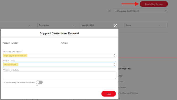 - Select “Title/Registration Inquiry,” then “State Transfer” and include any details from your DMV